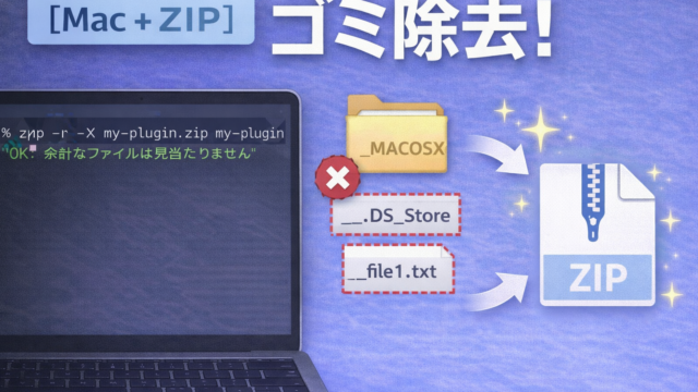 macOS MacでZIPに.DS_Storeや__MACOSXが混入するのをzip -Xで防ぐ MacでWordPressプラグインのZIPを作ると.DS_Storeや__MACOSXが混入する問題の解決法。zip -Xコマンドで除外する方法、dot_cleanでの掃除、Automatorでワンクリック化する手順まで、プラグイン審査の実体験をもとに解説。 2026.01.12 macOS
