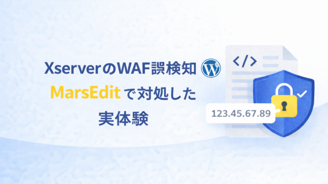 macOS XserverのWAF誤検知でコード記事が上がらない…MarsEditで投稿した実体験(XML-RPCはIP制限で安全運用) XserverのWAF誤検知でPHPやBashを含むWordPress記事が投稿できない問題を、MarsEditによる投稿経路の切り替えで回避した実体験。XML-RPCのIPホワイトリスト運用やアプリケーションパスワードの対処法まで解説。 2026.01.12 WordPressmacOS