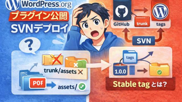 macOS WordPress.orgにプラグインをSVNで公開する手順|初回デプロイで踏んだ落とし穴と対処法 WordPress.orgプラグインの初回SVNデプロイ手順を実体験ベースで解説。assetsの配置場所、Stable tagとtagsの関係、TortoiseSVNの使い方、GitHub連携ワークフローまでカバー。 2026.01.02 ProgramWordPressmacOS