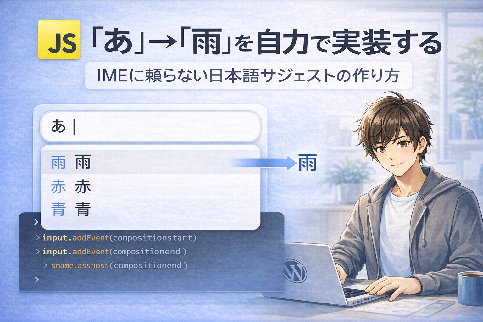 日本語サジェストの後編です。前編で作った検索ロジックにUIを組み合わせ、キーボード操作・フォーカス制御・API連携まで含めた「コピペで動く完全版」を仕上げます。