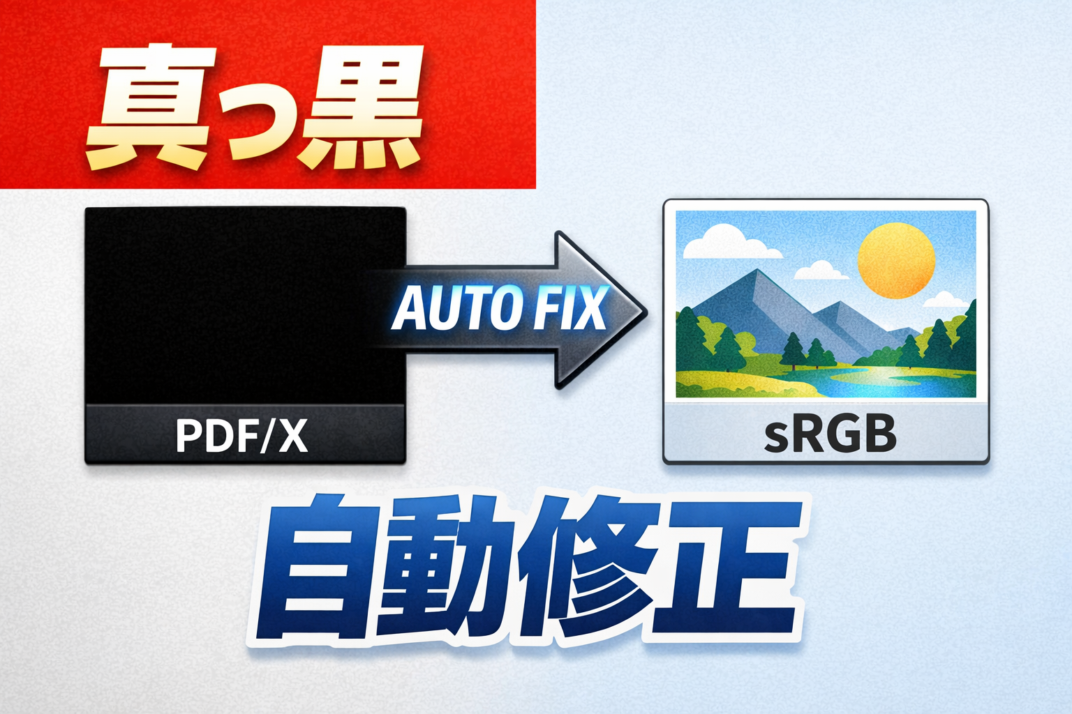 今回の修正で多くのケースに対応できるようになりましたが、特殊なICCプロファイルを使用したPDFや、複雑なカラー定義を含むPDFでは、変換がうまくいかない可能性があります。その場合は、従来どおりPDF保存設定の変更で対応してください。