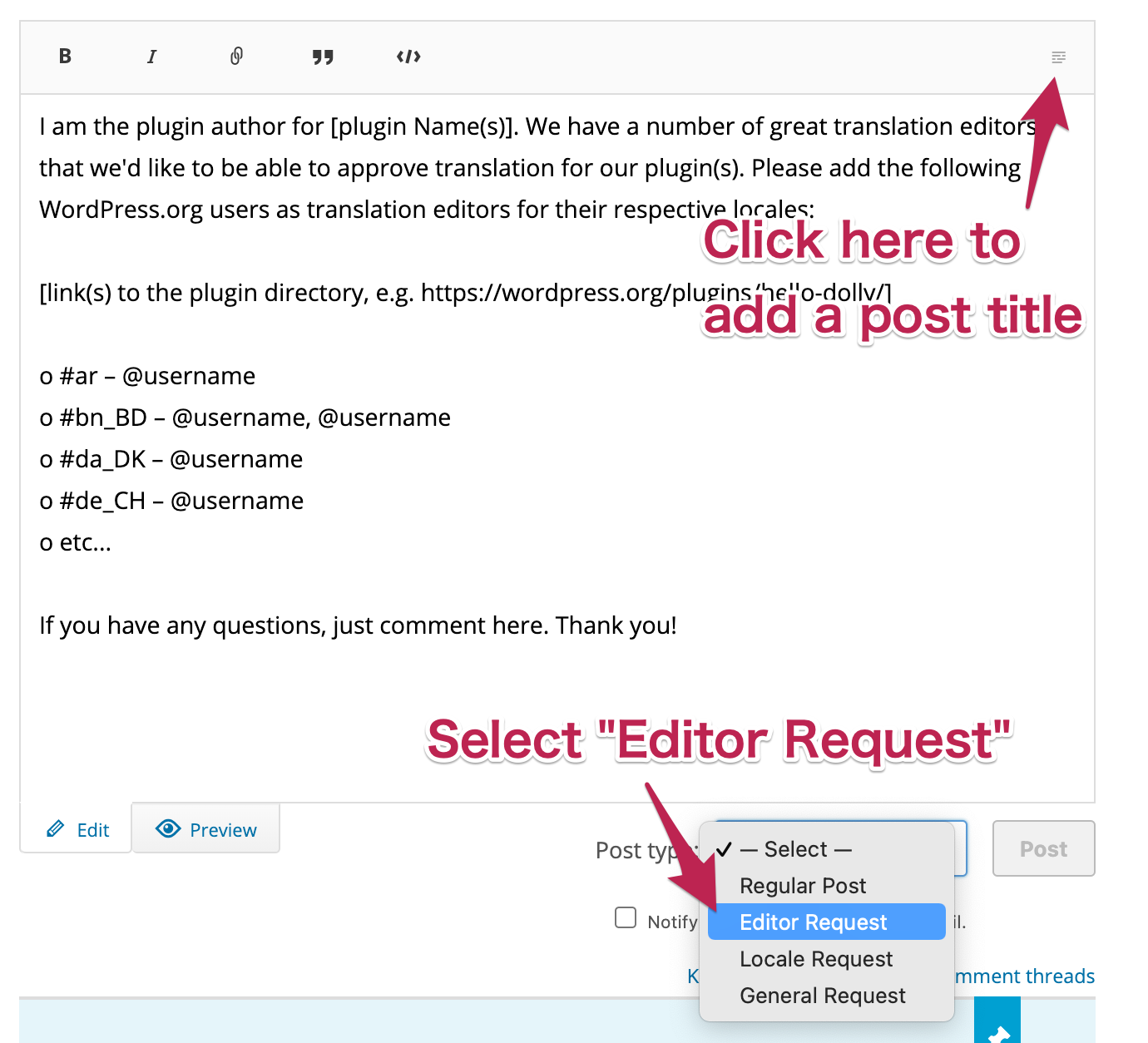 Hello Polyglots, I am the plugin author for [PLUGIN NAME]. Please add the following WordPress.org user as translation editor for locales: o #ja – @[YOUR USERNAME] Name: [PLUGIN NAME] URL: https://wordpress.org/plugins/[PLUGIN SLUG]/ If you have any questions, just comment here. Thank you! #editor-requests |