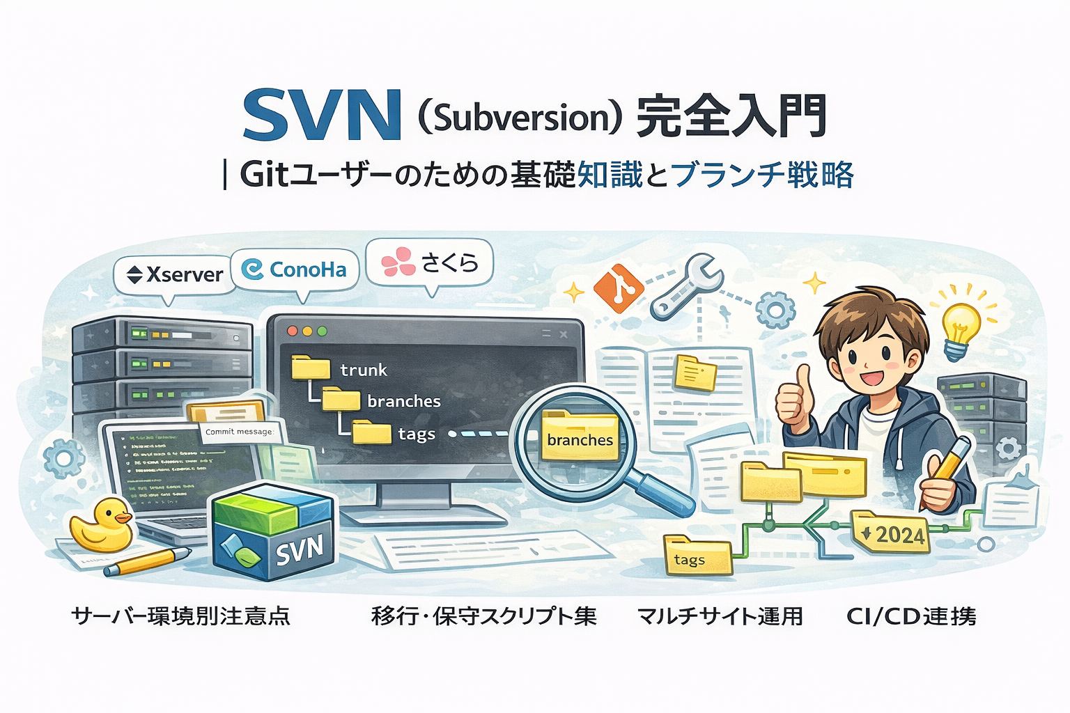 この記事では、SVNの基本概念から実践的なブランチ戦略まで、Gitユーザーの視点で体系的に解説します。後編ではWordPress.orgへのプラグイン公開手順とTortoiseSVNの使い方を扱いますので、あわせてご覧ください。