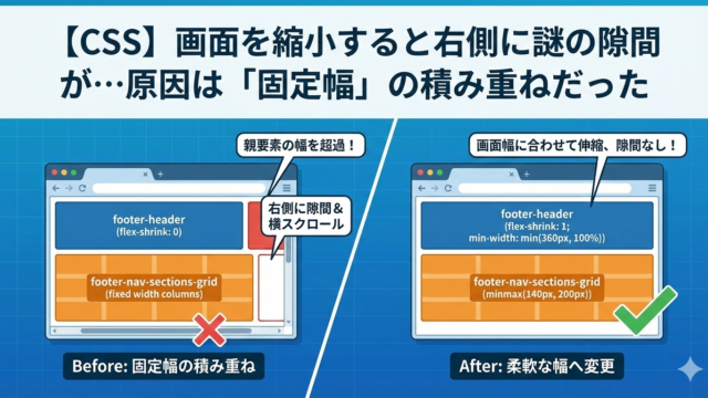 画面を縮小すると右側に隙間ができる原因を実体験から解説。flex-shrink: 0や固定幅グリッドの罠と、minmax()での解決策を紹介。DevToolsでの原因特定からチェックリストまで、レスポンシブ崩れを根本解決する方法をまとめました。