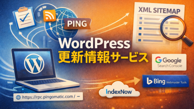 WordPress WordPressの「更新情報サービス(PING送信)」はまだ必要?有用性・注意点・代替案まで【2026年版】 WordPressの更新情報サービス(PING送信)は今も必要?結論はPing-O-Matic 1行で十分。大量PINGリストの落とし穴と、サイトマップ・Search Console・IndexNowなど本当に効く代替策を解説します。 2026.03.13 WordPress