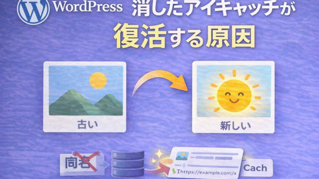 WordPress WordPressで削除したアイキャッチが戻る|同名画像×キャッシュ層の切り分けと最短解決 WordPressでアイキャッチ画像を差し替えたのに古い画像が表示される。原因はキャッシュだけでなく、同名ファイルを上書きしないwp_unique_filename仕様と削除時のサムネイル残存。FTP確認→キャッシュ全消し→ファイル名変更の最短ルートを解説。 2026.01.20 WordPress