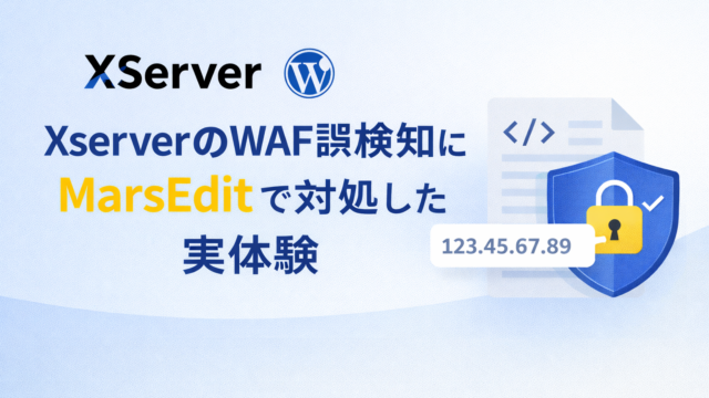 WordPress XserverのWAF誤検知でコード記事が上がらない…MarsEditで投稿した実体験(XML-RPCはIP制限で安全運用) Xserver上のWordPressでPHP/Bashコード記事がWAF誤検知し501や「管理画面アクセス拒否」に。MarsEditで投稿し、XML-RPCはIPホワイトリストで安全運用する手順を実体験で解説。 2026.01.12 WordPress