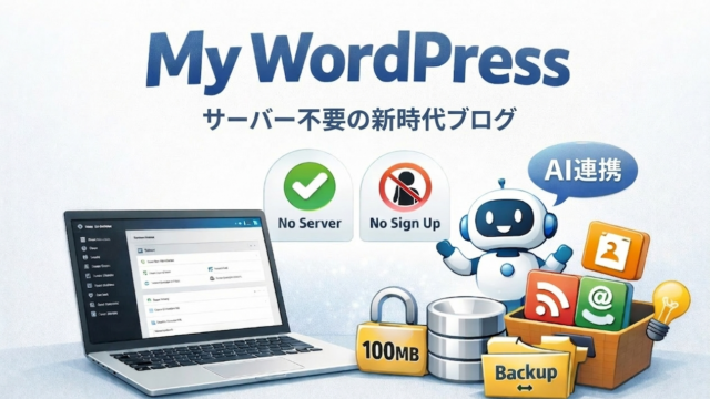 WordPress My WordPress(my.wordpress.net)完全ガイド|ブラウザだけで本物のWordPressが動く無料サービスを徹底解説【2026年版】 ブラウザだけで本物のWordPressが動く「My WordPress(my.wordpress.net)」を徹底解説。サーバー・ドメイン・登録不要で無料で使える仕組みから、App Catalog・AI連携・制限事項・活用シーンまで実務で使えるレベルで解説します 2026.03.13 WordPress