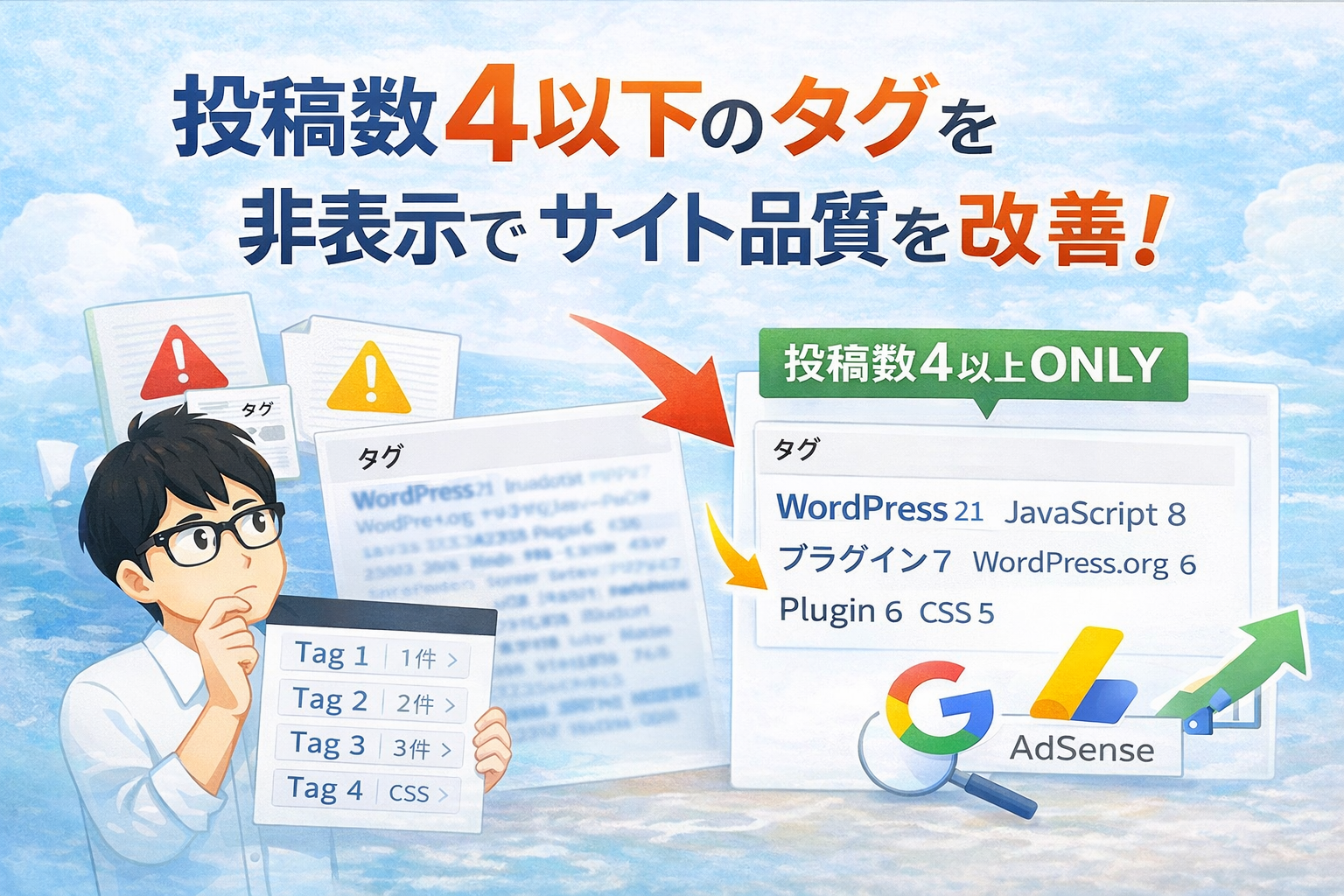 SNSの感覚でブログにタグを付けていませんか? Twitter(X)やInstagramでは、たくさんのハッシュタグを付けることが当たり前ですよね。しかし、WordPressブログで同じようにタグを乱発すると、SEO・ユーザビリティ・AdSense審査すべてに悪影響を及ぼします。 この記事では、登録数が少ないタグを非表示にすることで、サイトの品質を劇的に改善する方法を、コピペで使えるコード付きで解説します。 この記事で解決できること: